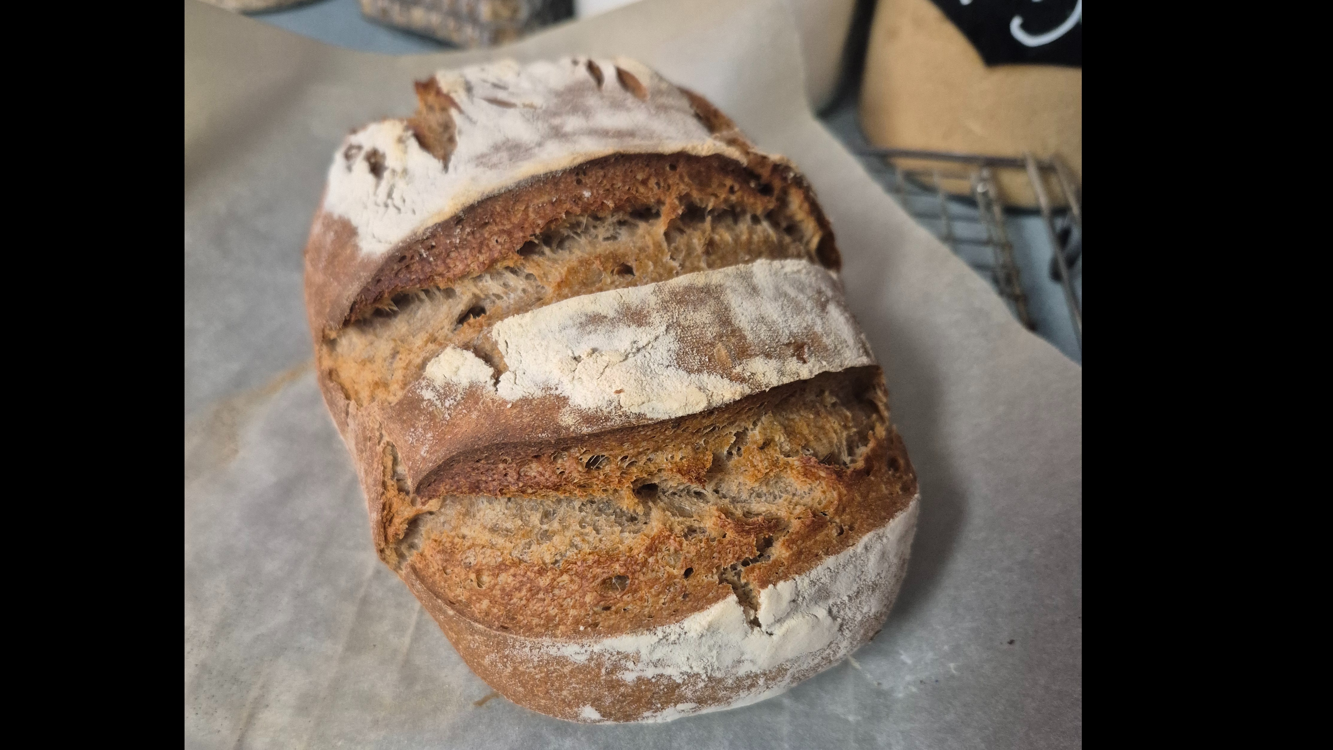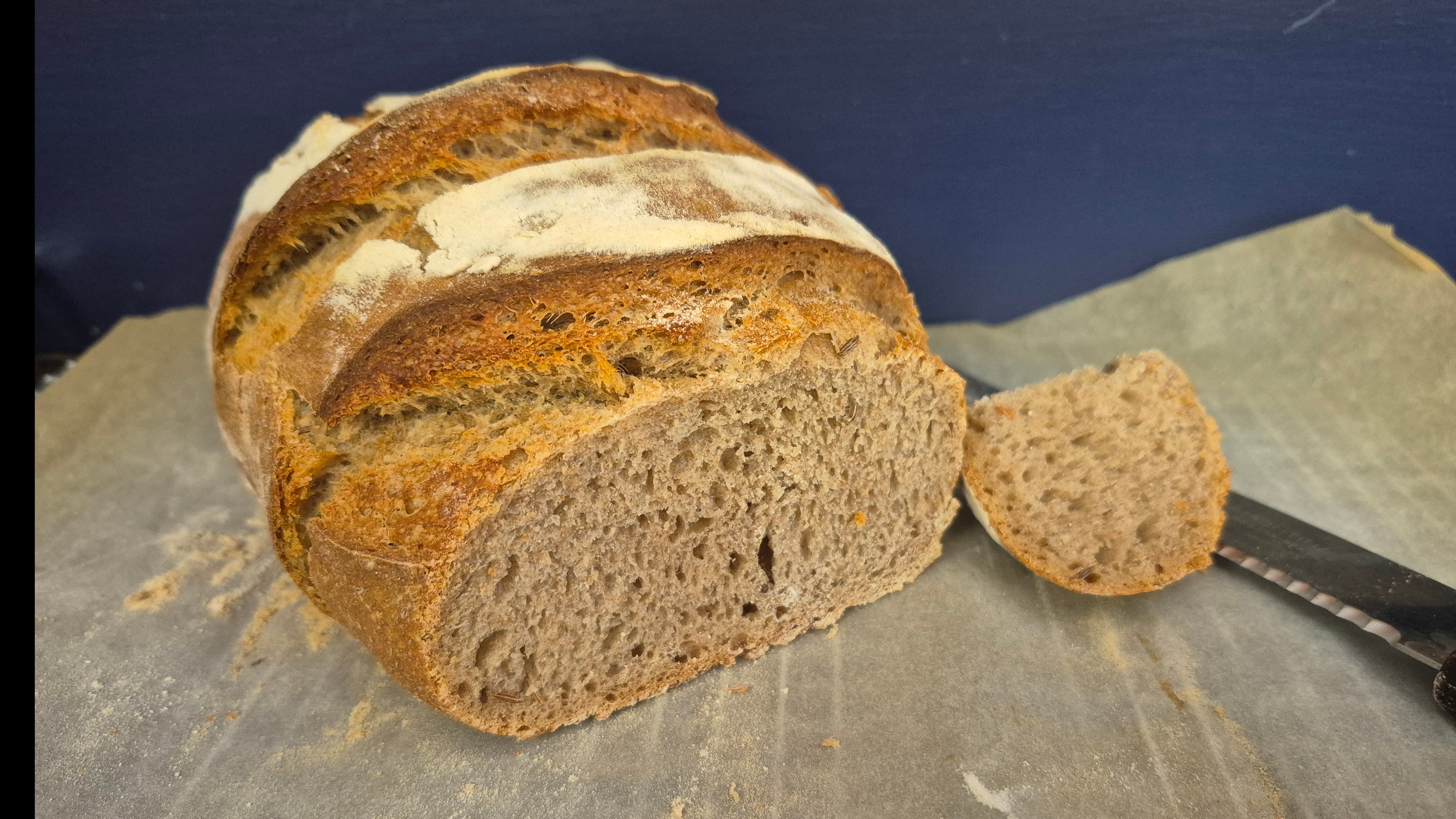 Made with Rye Flour & sourdough starter, this loaf is a great combination of both. The soft texture on the inside is perfect for grilled cheese or just toasting with some butter. (Made with Caraway seeds).
